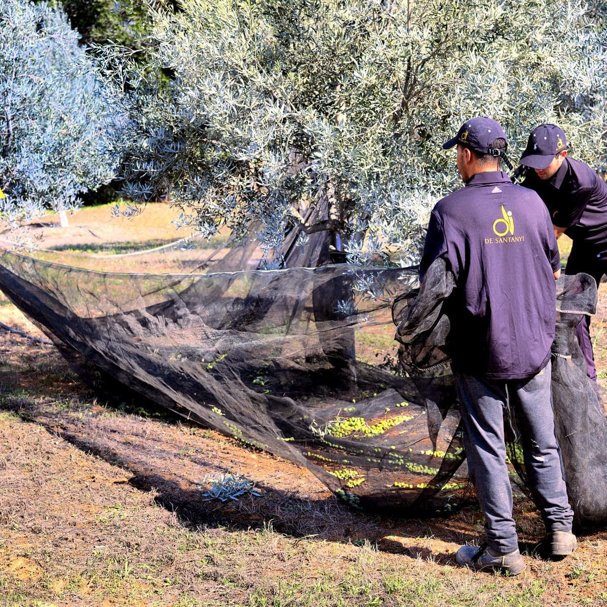 Die noch grünen Oliven werden von Hand geerntet, was sehr arbeitsintensiv ist, weil die Oliven noch sehr fest am Baum haften. Jede Sorte wird für sich geerntet und verarbeitet, um den eigenständigen Charakter zu bewahren. Erst nach der Pressung und Verkostung wird entschieden, in welchem Verhältnis unsere 3 Sorten vereint werden (Coupage), um den exklusiven Geschmack des OLI DE SANTANYI zu erhalten.